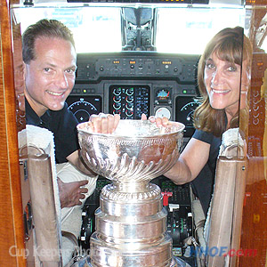 Henry and Susan Samueli prepare the Cup for takeoff in the family's private jet. (Mike Bolt/HHOF)