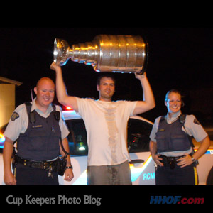 Rome hoists the Cup alongside two Royal Canadian Mounted Police. (Mike Bolt/HHOF)