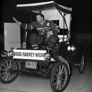 Doug Harvey salutes the crowd as he was honoured by the Montreal Canadiens during a game on December 3, 1959.