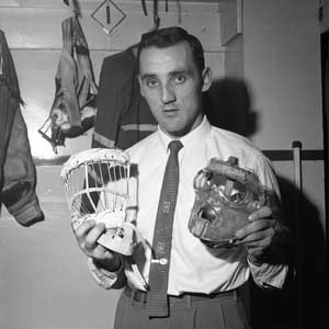 Jacques Plante shows the two experimental practice masks he wore prior to donning a mask on a regular basis.