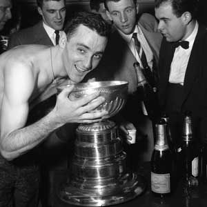Jacques Plante gets ready to drink out of the Stanley Cup during the dressing room celebration on April 10, 1956.