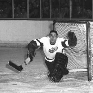 Terry Sawchuk tracks the puck like a bird of prey during a game at the Montreal Forum on Halloween night in 1959.