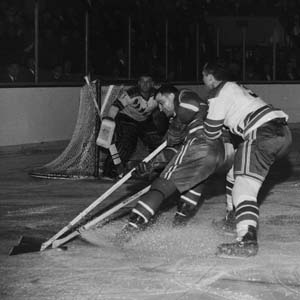 Gump Worsley readies himself as Boom Boom Geoffrion powers his way to the New York goal.