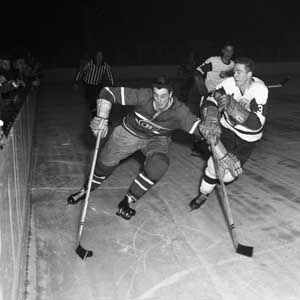 Marcel Pronovost attempts to ride Jean Beliveau into the boards during the 1956-57 season.