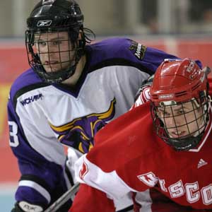 L-R : Minnesota State's Joel Hanson and Wisconsin's Joe Pavelski battle during an NCAA hockey game in Mankato, MN on February 25, 2006.