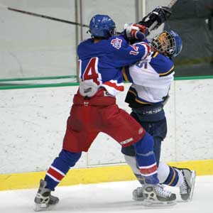 L-R : Robbinsdale Armstrong's Austin Riches checks Wayzata Trojans' Joey Miller during the 2006 Minnesota high school 4AA section tournament on March 1, 2006.