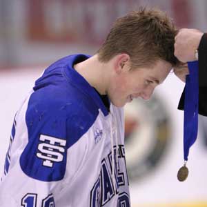 Captain Jordan Schroeder accepts his gold medal with the St. Thomas Cadets, 2005-06 Minnesota State Class 1A high school hockey champions on March 11, 2006.