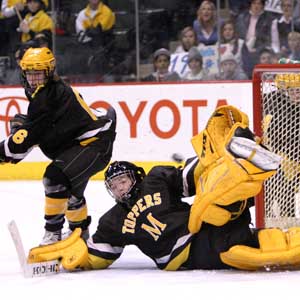 Duluth Marshall Hill Toppers high school goalie Paul Jones makes a leg pad save at the Minnesota State hockey tournament class A championship game on March 11, 2006.