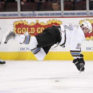 Bryan Nathe of the ECHL's Phoenix Roadrunners trips during a game that started at midnight on December 17, 2007 against the Las Vegas Wranglers in Las Vegas.