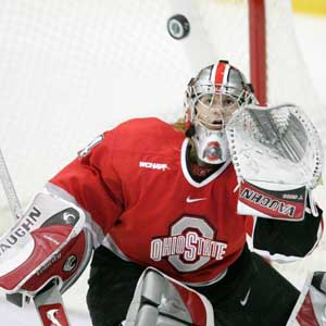 Deidre Facklis makes a save against the Minnesota Gophers at the Ridder Arena in Minneapolis, MN on October 18, 2008.