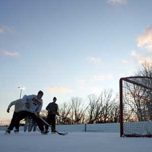 Pick-up hockey at the Prairie Lake outdoor rink in Lakeville, MN on January 1, 2009.