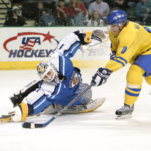 Finland's Joonas Hallikainen makes the save on Sweden's Robert Nilsson during the IIHF World Men's U20 Championship on January 3, 2005.