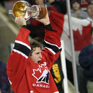 Captain Mike Richards proudly hoists the IIHF World Men's U20 Championship trophy on January 4, 2005.