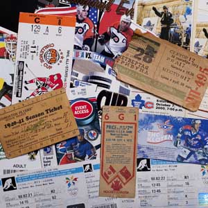 Ticket stubs from various teams, leagues and marquee events, including: Game 2 and Game 8 of the 1972 Summit Series and the gold medal game of the 1998 Winter Olympics. (Photo by Matthew Manor/Hockey Hall of Fame)