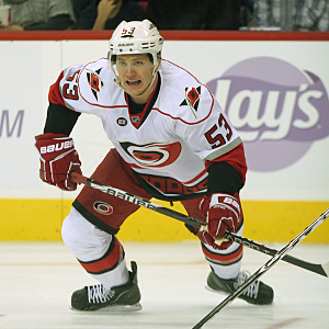 Jeff Skinner on October 22, 2012 at the MTS Centre in Winnipeg, Manitoba, Canada. Winnipeg beat Carolina 5 - 3.