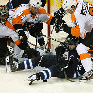 L - R : Ilya Bryzgalov, Kimmo Timonen, Captain Andrew Ladd and James van Riemsdyk on February 21, 2012 at the MTS Centre in Winnipeg, Manitoba, Canada. Philadelphia beat Winnipeg 5 - 4 in overtime.