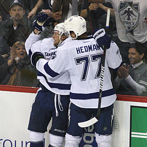 L - R : Steven Stamkos and Victor Hedman celebrate goal number 60 of the season by Stamkos on April 7, 2012 at the MTS Centre in Winnipeg, Manitoba, Canada. Tampa Bay beat Winnipeg 4 - 3 in overtime.