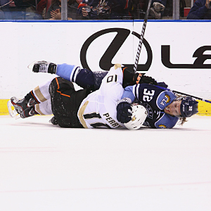 L - R : Corey Perry and Kris Versteeg take a tumble on February 19, 2012 at the BankAtlantic Center in Sunrise, Florida, USA.