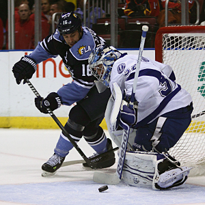 L - R : Marco Sturm tries the wrap around on Mathieu Garon on November 6, 2011 at the BankAtlantic Center in Sunrise, Florida, USA.