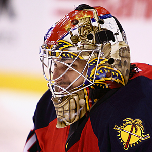 Goalie Jose Theodore figuratively and physically wears his mask on February 17, 2012 at the BankAtlantic Center in Sunrise, Florida, USA.