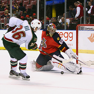 L - R : Kyle Rau shoots and Jose Theodore makes the pad save on February 23, 2012 at the BankAtlantic Center in Sunrise, Florida, USA.