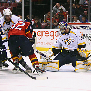L - R : Kris Versteeg tries to score on Pekka Rinne on March 3, 2012 at the BankAtlantic Center in Sunrise, Florida, USA.