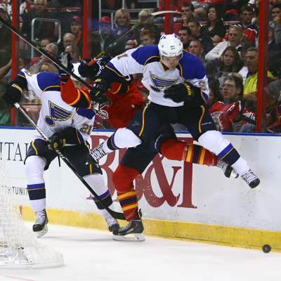 St. Louis Blues Vladimir Tarasenko defies gravity by the end boards. (Ward Benjamin/HHOF)