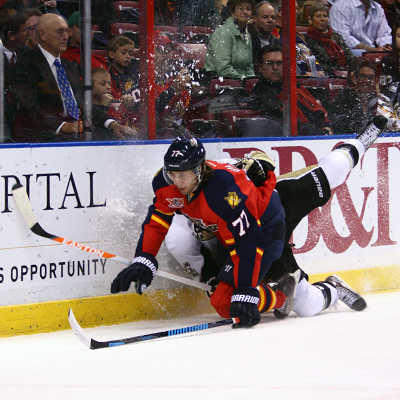 Florida Panthers Tom Gilbert flies through the air in post collision mode. (Ward Benjamin/HHOF)