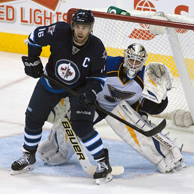 Winnipeg Jets Captain Andrew Ladd attempts to screen St. Louis Blues goalie Brian Elliott (Rusty Barton/HHOF)