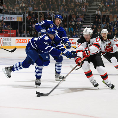 New Jersey Devils Michael Ryder tries to elude the Toronto defence during the 2013 Hockey Hall of Fame Game. (Dave Sandford/HHOF)
