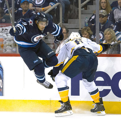 Winnipeg Jets Evander Kane side steps the fierce Nashville Predators Shea Weber's hit. (Rusty Barton/HHOF)