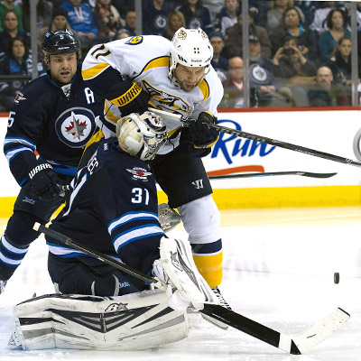 Nashville Predators David Legwand crashes into Winnipeg Jets goalie Ondrej Pavelec. (Rusty Barton/HHOF)