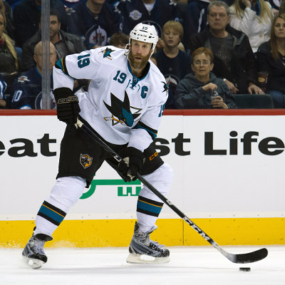 San Jose Sharks Joe Thornton stands tall and prepares to move the puck. (Rusty Barton/HHOF)
