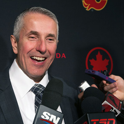 Calgary Flames coach Bob Hartley laughs out loud during the post game interviews. (Rusty Barton/HHOF)