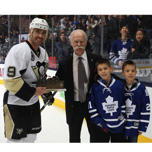 Honoured Member Lanny McDonald awards Pascal Dupuis Player of the Game at the 2014 Hockey Hall of Fame Game. (Dave Sandford/Hockey Hall of Fame)
