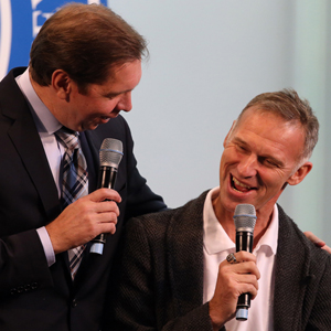TSN's Gord Miller and 2014 Inductee Dominik Hasek sharing a laugh at the Scotiabank Inductee Fan Forum in the Esso Great Hall at the Hockey Hall of Fame.(Dave Sandford/Hockey Hall of Fame)