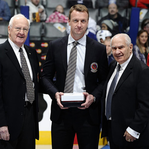 2014 Inductee Rob Blake receives his Honoured Members Blazer and watch prior to the Haggar Hockey Hall of Fame Legends Classic. (Graig Abel/Hockey Hall of Fame)