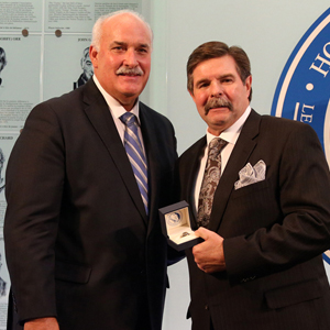 2014 Inductee Bill McCreary receives his Honoured Members ring from Chairman of the Hockey Hall of Fame Selection Committee John Davidson. (Dave Sandford/Hockey Hall of Fame)