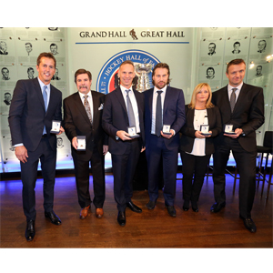 The 2014 Inductees Modano, McCreary, Hasek, Forsberg, Line Gignac Burns, representing her late husband Pat Burns, and Rob Blake are all smiles after the ring presentation. (Dave Sandford/Hockey Hall of Fame)