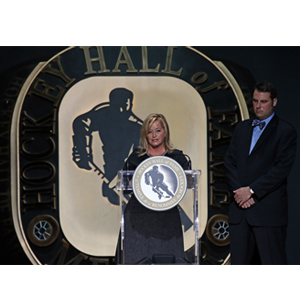 Line Gignac Burns representing her late husband 2014 Inductee Pat Burns speaks to the crowd while son Jason looks on during the Hockey Hall of Fame Induction Ceremony. (Dave Sandford/Hockey Hall of Fame)