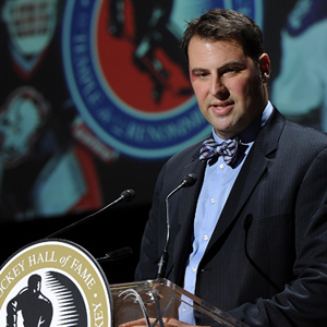 Jason Burns representing his late father 2014 Inductee Pat Burns speaks at the Hockey Hall of Fame Induction Ceremony. (Matthew Manor/Hockey Hall of Fame)