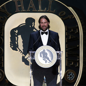 2014 Inductee Peter Forsberg speaks to the crowd at the 2014 Hockey Hall of Fame Induction Ceremony. (Dave Sandford/Hockey Hall of Fame)