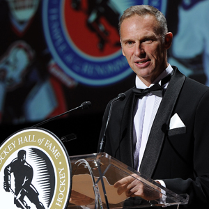 2014 Inductee Dominik Hasek speaks at the 2014 Hockey Hall of Fame Induction Ceremony. (Matthew Manor/Hockey Hall of Fame)