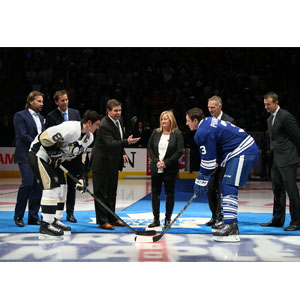 Ceremonial faceoff prior to the 2014 Hockey Hall of Fame Game. (Dave Sandford/Hockey Hall of Fame)