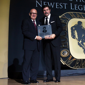 2014 Inductee Bill McCreary receives his plaque from Honoured Member Ray Scapinello at the 2014 Hockey Hall of Fame Induction Ceremony. (Dave Sandford/Hockey Hall of Fame)