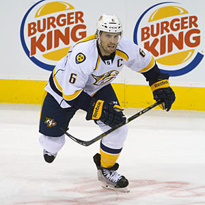 Nashville Captain Shea Weber skates up ice during an NHL game on October 17, 2014 at the MTS Centre in Winnipeg, Manitoba, Canada. The Nashville Predators shutout the Winnipeg Jets 2-0. (Rusty Barton/HHOF)