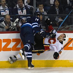 Anthony Peluso rocks Dennis Wideman during an NHL game on October 19, 2014 at the MTS Centre in Winnipeg, Manitoba, Canada. The Calgary Flames beat the Winnipeg Jets 4-1. (Rusty Barton/HHOF)