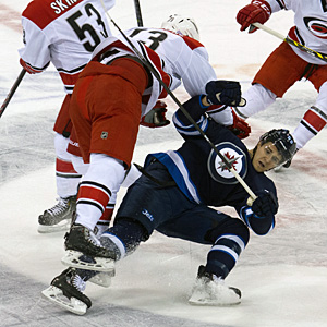 Mark Scheifele is hit by Brett Bellemore during an NHL game on October 21, 2014 at the MTS Centre in Winnipeg, Manitoba, Canada. The Winnipeg Jets beat the Carolina Hurricanes 3-1. (Rusty Barton/HHOF)