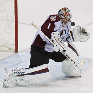 Semyon Varlamov keeps the puck in his eyesight during an NHL game on February 8, 2015 at the MTS Centre in Winnipeg, Manitoba, Canada. The Winnipeg Jets beat the Colorado Avalanche 5-3. (Rusty Barton/HHOF)