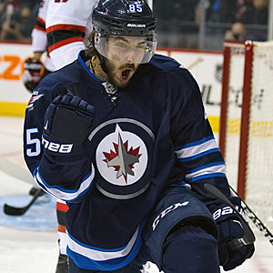 Goal celebration by Matthieu Perreault during an NHL game on November 18, 2014 at the MTS Centre in Winnipeg, Manitoba, Canada. The Winnipeg Jets beat the New Jersey Devils 3-1. (Rusty Barton/HHOF)
